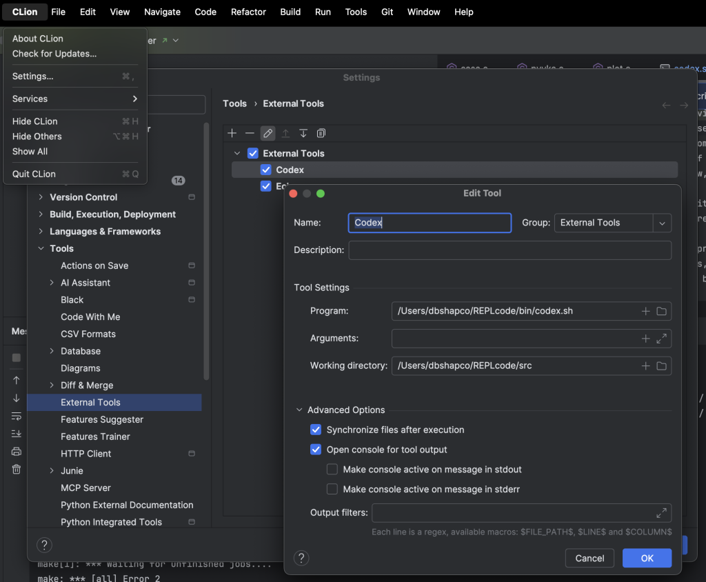 While I edit code in emacs, I do love the visual debuggers in IDEs over gdb and lldb and use CLion for its cross platform support. I can’t speak to all IDEs, but CLion allows easy integration of shell scripts as External Tools with macros like $FilePath$ to pass IDE context to the shell script. Many of the other apps and IDEs I peeked at supported customizations, but felt klunky and bolted on and less powerful, flexible, and portable than simple shell scripts.